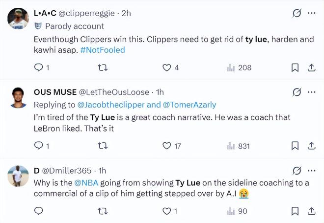有很多的船蜜都认为球队该解雇泰伦卢同时应该交易掉科怀-莱昂纳德;泰伦卢只有在执教勒布朗时有过高光瞬间,他并不适合执教其他的球员与球队。