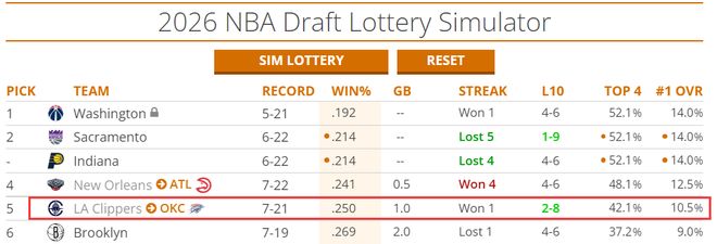 目前船蜜唯一的期待就是快船可以阻止雷霆抽中状元签,目前2026年快船签是在雷霆手中,状元签概率10.5%,前四签概率42.1%。