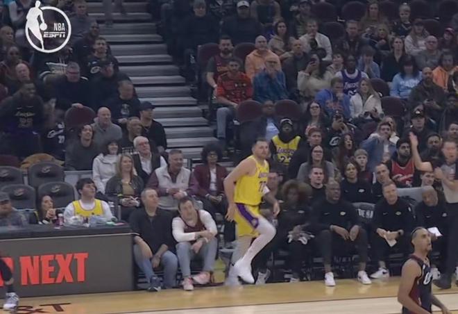 比赛第一节,湖人球员东契奇投篮后撤的过程中踩到了骑士主场地板的边缘,一脚踩空导致崴脚,之后返回了更衣室。