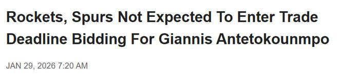 北京时间1月29日,据ESPN名记麦克马洪与邦坦普斯报道,马刺队与火箭队均手握青年才俊与未来选秀权的组合,理论上完全有能力向雄鹿队开出交易报价,追求字母哥,且不必彻底放弃本赛季的争冠竞争力。但随着字母哥2月5日NBA交易截止日前进入交易市场,外界预计这两支球队均不会参与到这场争夺战中。