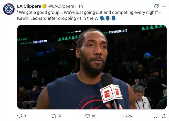 赛后伦纳德接受采访,他说道:我们是一支出色的球队,我们每一晚都为了胜利全力以赴去拼搏竞争,我们有一个目标。