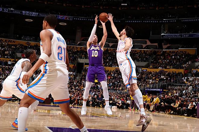 本场比赛中,在交易截止日前刚刚从亚特兰大老鹰加盟湖人的替补后场新援卢克-肯纳德(Luke Kennard)的表现还算是中规中矩。肯纳德全场出场24分13秒,投篮5中3,三分线外2中1,得到了7分1篮板1助攻1抢断的数据,还有4次犯规,正负值为-7。其实从表现来看,肯纳德的整体状态还是不错的,他在进攻端还是展现出了自己全面的得分能力,他的手感看起来也是不错的。问题就在于,肯纳德完全没有办法得到更多的出手机会,这种情况下他在进攻端的威力,特别是他的投射能力,也没有办法发挥出来。肯纳德本来就是一名攻强于守的球员,指望他在其他方面起到更大的作用显然也是一件不太现实的事情。很显然,湖人还是没有开发出肯纳德的最大价值,他的功能并没有体现出来。