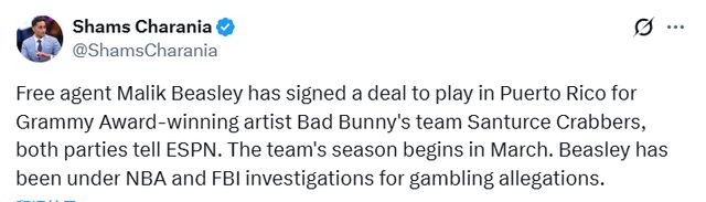北京时间2月14日,据名记Shams报道,自由球员马利克-比斯利已签约加盟由格莱美获奖歌手坏痞兔(Bad Bunny)拥有的波多黎各职业篮球队——桑图尔塞螃蟹队。坏痞兔是名模詹娜的前男友。