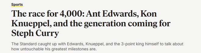 库里盯上了两位年轻球员:森林狼球星安东尼-爱德华兹,以及黄蜂新秀康-克努佩尔。前者是同年龄历史三分最多的球员,后者则是本赛季联盟新秀三分王。全明星赛前一个月,勇士都和这两队交过手,他们都承认,库里的纪录虽令人望而生畏,但生涯总三分比单季402记更有希望实现。