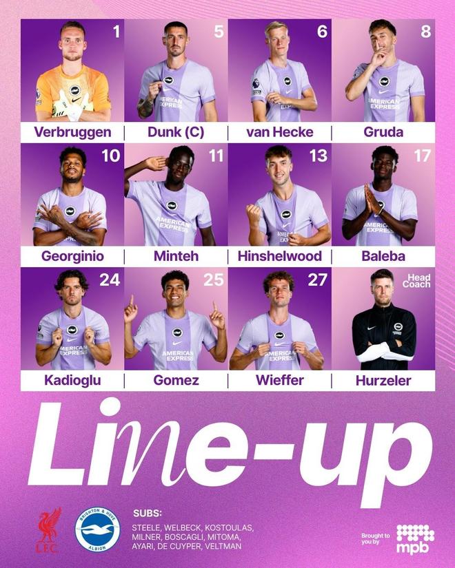 布莱顿首发:1-费布鲁亨、13-欣谢尔伍德、5-邓克、6-范黑克、27-魏费尔、25-迭戈-戈麦斯、17-巴莱巴、11-明特、8-格鲁达、24-卡迪奥卢、10-吕特