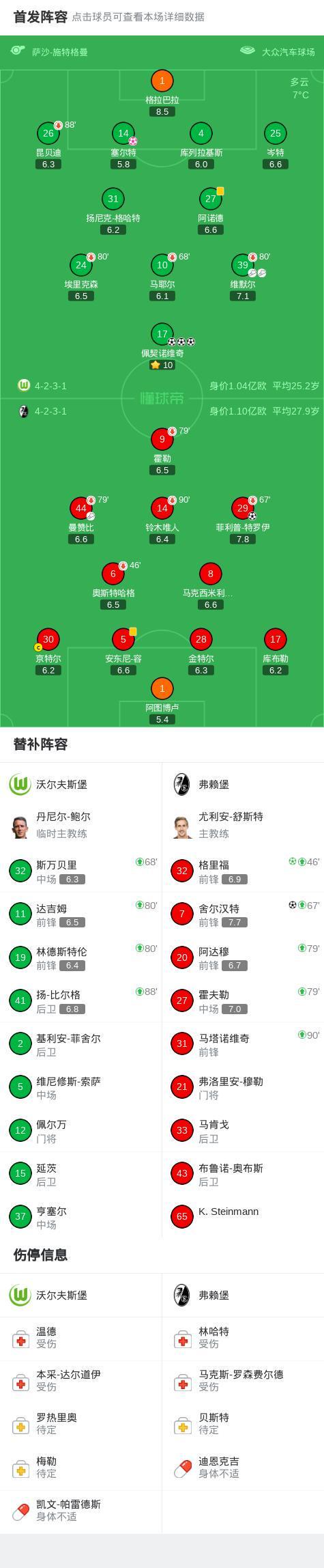 北京时间12月20日德国足球顶级联赛 联赛 第15轮,沃尔夫斯堡主场对阵弗赖堡。沃尔夫斯堡佩契诺维奇帽子戏法,塞尔特自摆乌龙。弗赖堡菲利普-特罗伊破门,舍尔汉特破门,格里福破门。最终比分沃尔夫斯堡 3-4 弗赖堡。