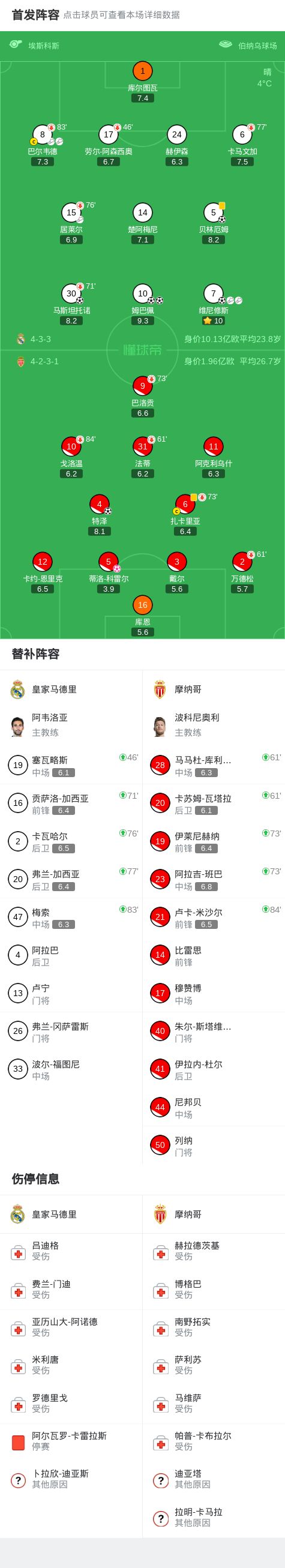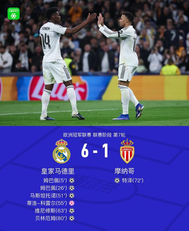 北京时间1月21日欧洲冠军联赛 联赛阶段 第7轮,皇家马德里对阵摩纳哥。上半场,巴尔韦德和维尼修斯相继助攻,姆巴佩完成双响。下半场,维尼修斯助攻,马斯坦托诺收获个人欧冠处子球。维尼修斯传球,科雷尔自摆乌龙。皇马后场玩火,特泽扳回一城。巴尔韦德助攻,贝林厄姆建功。全场比赛结束,皇马6-1大胜摩纳哥。
