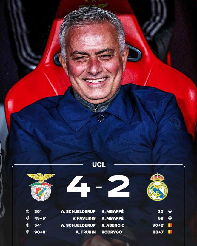 最后阶段皇马疯狂压上,却始终无法再度破门;伤停补时阶段,情绪彻底压垮了理智,阿森西奥、罗德里戈接连染红,被直接罚下。第97分钟,本菲卡任意球吊入禁区,门将特鲁宾冲到前场抢点头球破门,本菲卡4-2皇马,这一夜穆里尼奥又创造了历史,62岁的小老将硬是把本菲卡送进附加赛。