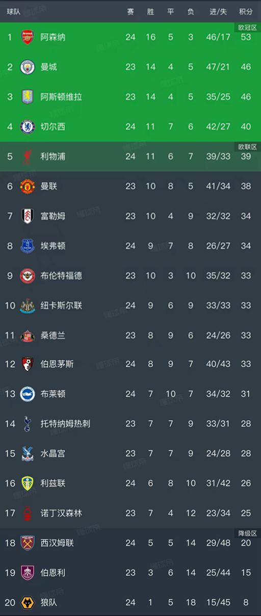 随着枪手4-0、蓝军3-2绝杀,英超最新积分榜如下!利物浦4-1排第5