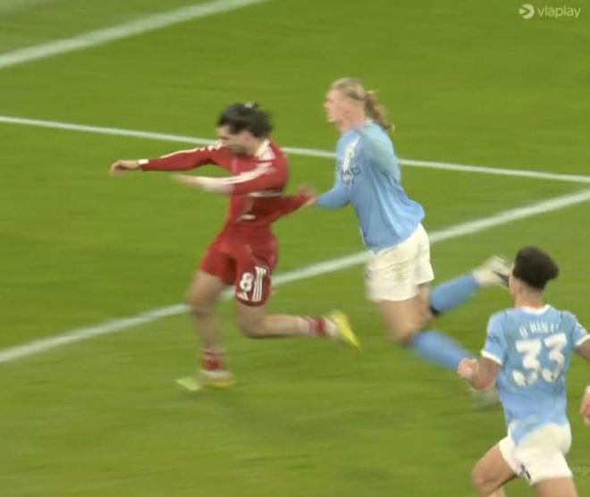 根据主裁判的解释:「哈兰德在皮球入网之前确实拉拽了索博斯洛伊的球衣,因此进球被判无效。然而,由于这个结果,之前的进攻有利决定也被逆转,索博斯洛伊因为先拉扯了哈兰德,阻止了一次明显的得分机会,因此染红,曼城得到一记禁区外的直接任意球。」