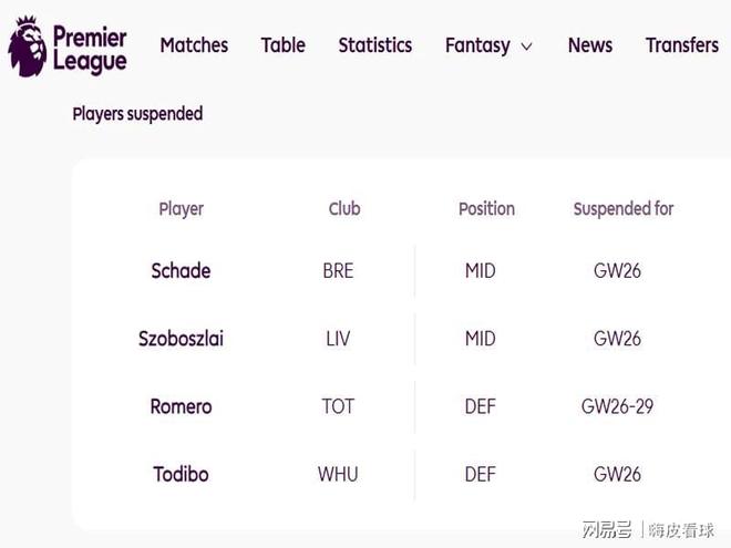 同样是红牌,热刺的罗梅罗就没有那么幸运了,英超官方信息显示,罗梅罗需要停赛四场,由于热刺足总杯出局,四个对手都是来自英超,分别是纽卡斯尔、阿森纳、富勒姆和水晶宫,刚好在客场挑战利物浦的时候,可以回归赛场。