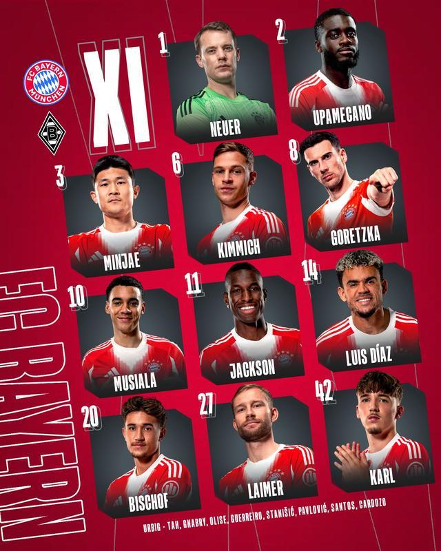 北京时间3月7日03:30,德甲 第25轮,拜仁慕尼黑主场迎战门兴格拉德巴赫,赛前双方球队首发名单公布如下: