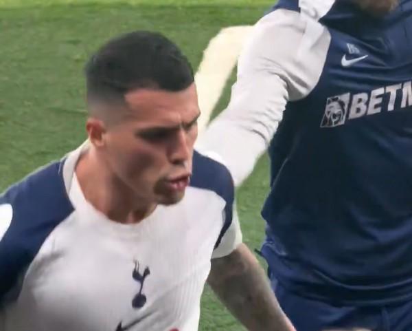 一名热刺工作人员上前将他带向替补席,镜头拍到波罗猛砸座椅、在替补席扔水瓶,随后画面切回比赛。